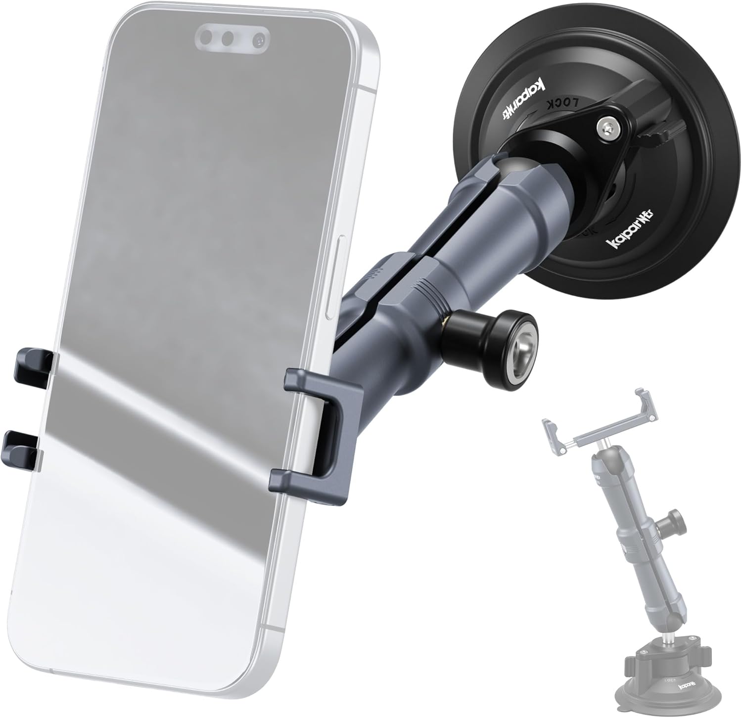 Car Phone Holder Kit, Adjustable Phone Clip and 360-Degree Rotation Dual Socket Arm with Suction Cup Mount Base for Mounting on Car Dashboards, Phone Width of 2.56-3.74" Smartphone (KPS-11)