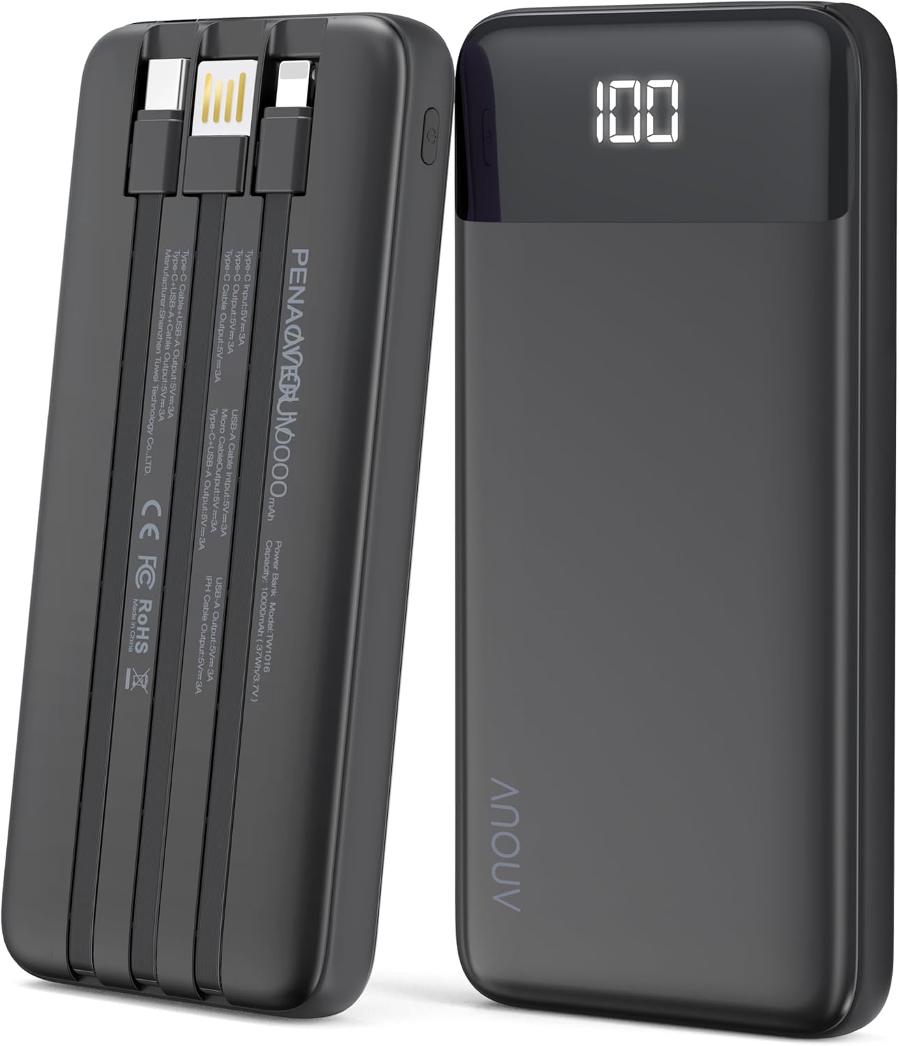 Portable Charger with Built-in Cables 10000mAh Power Bank with Cords, Slim Battery Pack with LED Display, Travel Essential Portable Charger for iPhone 17/16/15/14/13 Series, Samsung Google Pixel iPad