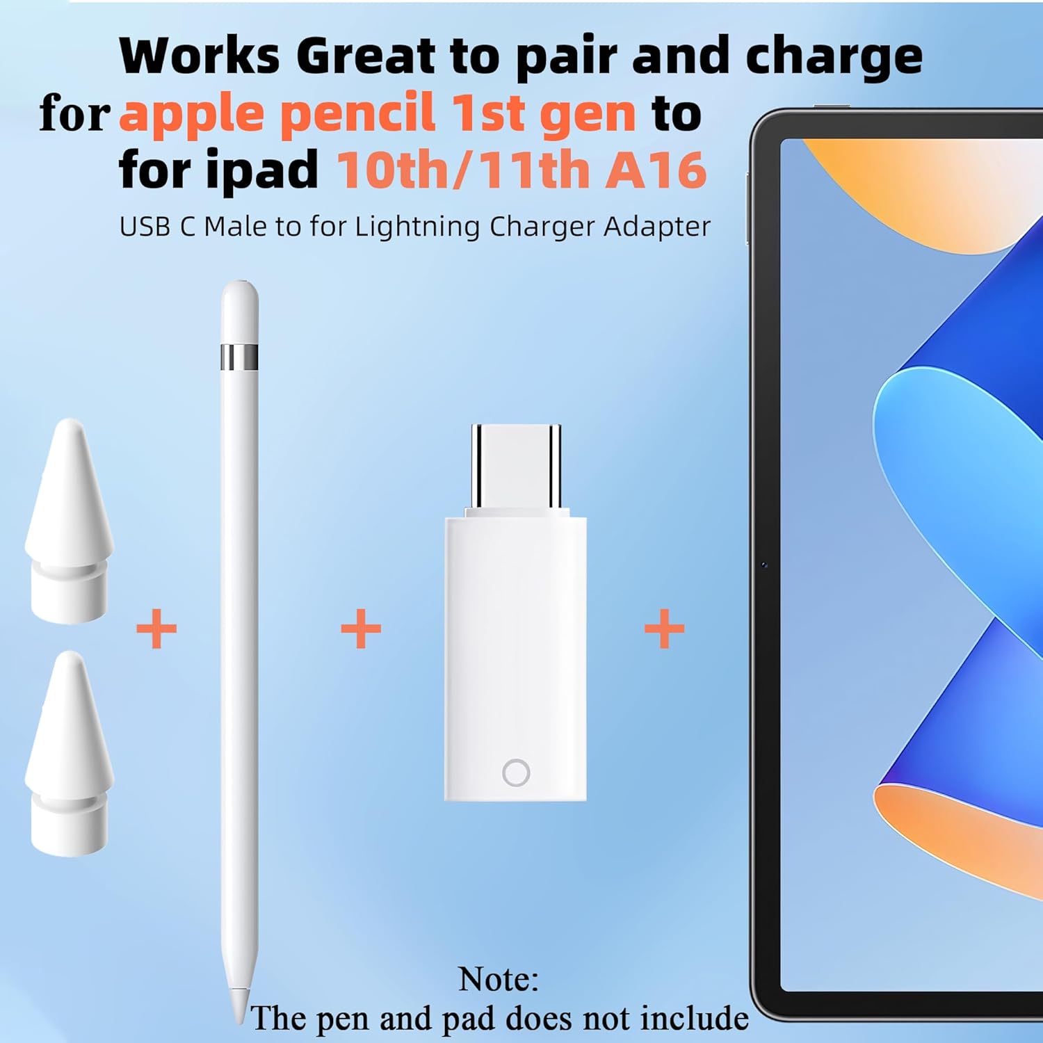 3 Pack USB C to Pencil Charger Adapter for Apple Pencil 1st Generation,USB C Male to for Lightning Female Bluetooth Pair Connector for iPad A16 11th,10th,Pen Tips for iPencil 1 Gen