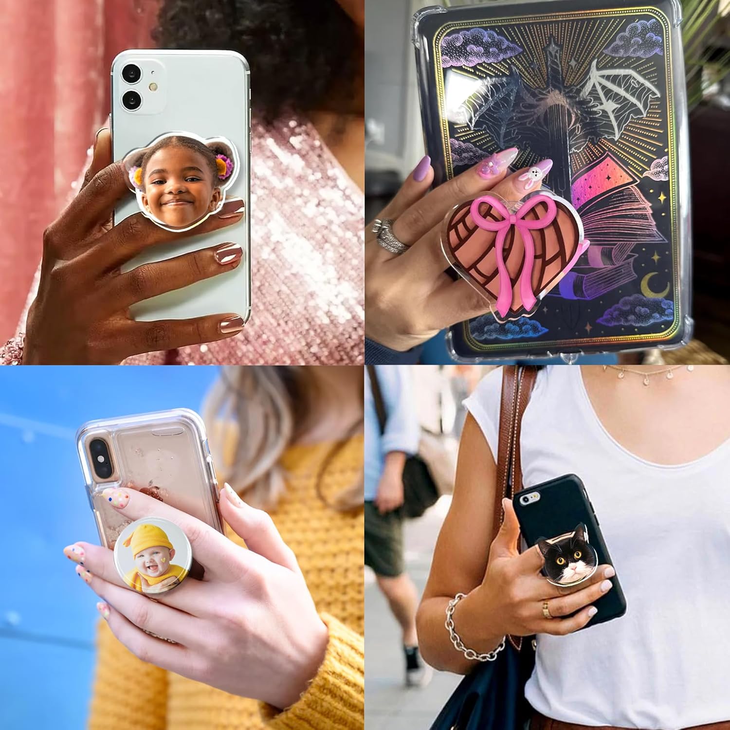 Custom Phone Grip Personalized Human and Pet Face Acrylic Photo Foldable Black Phone Holder Adhesive Socket for Kindle & All Phone Models Gift for Women Men