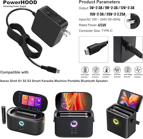 45W AC/DC Adapter Compatible with Ikarao Shell S1 S2 S3 Smart Karaoke Machine Portable Bluetooth Speaker 5-20V 1-2.25A Switching Power Supply Cord PD Charger USB C Cable PSU Mains