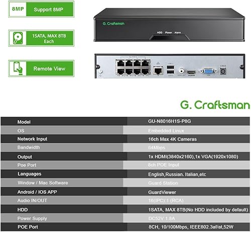 8CH PoE NVR with 4K HDMI Output, H.265, Supports 8TB HDD, ONVIF, Smart Detection, for CCTV Security Camera