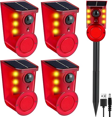 Qualirey 4 Pack Solar Outdoor Motion Sensor Alarm with Stake, 129db Sound Alert and Multi-Mode 6 LEDs Flash Warning Lights for Garden Farm Repelling Cat Dog Rabbit Raccoon Fox
