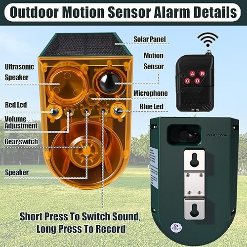 Qualirey 2 Pack Solar Outdoor Motion Sensor Alarm Ultrasonic Animal Deterrent Alarm 13 Sound 130 dB Loud Noise Maker with USB Remote Control 4 Mode Repels for Garden Yard Farm Home Security(Yellow)