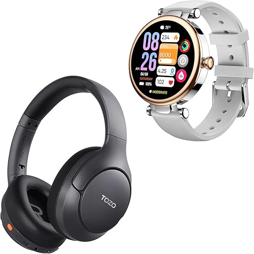TOZO HT3 Hybrid Noise Cancelling Headphones, 90H Playtime Wireless Over Ear Bluetooth Headset, S8 AMOLED Smart Watch for Women 1.32" HD Color Screen, Bluetooth Calls & Text