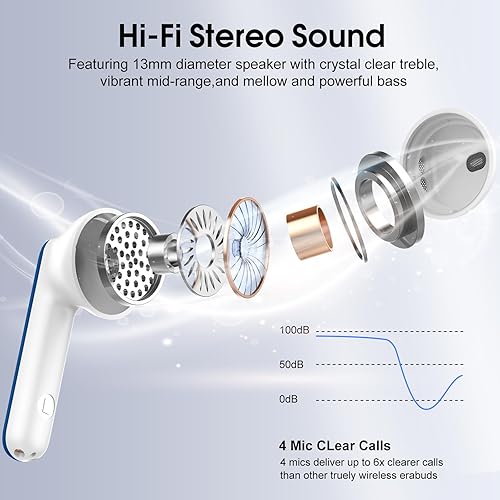 Wireless Earbuds, 2025 Bluetooth 5.4 Headphones in Ear buds, 40H HiFi Stereo Bluetooth Earbuds with 4 ENC Noise Cancelling Mics, IP7 Waterproof Ultralight Earphones with Dual LED Display USB C, Blue