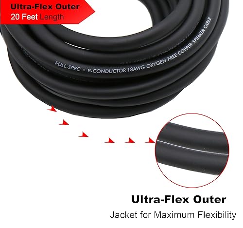 RonDexy 20-Feet 9-Conductor Speaker Cable, 18AWG Tinned OFC, 4-Channel Speaker Wire and Remote Wire Ultra-Flex and Easy Peel Jacket