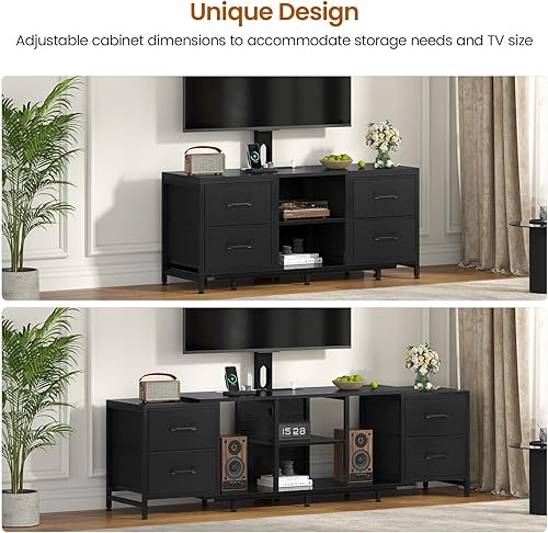Deformable TV Stand with Adjustable Mount and Power Outlet for TVs up to 32/50/55/65 inch, 4 Fabric Drawers and Open Shelves, Entertainment Center for Living Room (Black, Spatial)