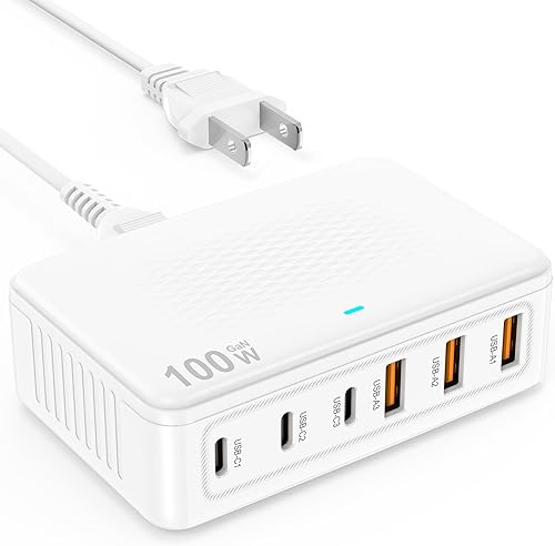 USB C Charger Block, 100W GaN 6 Port Fast USB Charging Station Hub, Wall Charger Power Adapter Plug Cube Brick for Apple iPhone 17 16 15 14 13 12 11 Pro Max/iPad/Pixel/Samsung Galaxy S25 S24,5FT Cord