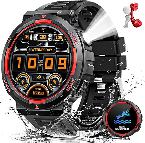 Military Smart Watch for Men with LED Flashlight Tactical Smart Watch 1.53”HD Screen Rugged Smartwatch 3ATM Waterproof 100+ Sports Fitness Tracker with Heart Rate Monitor for iOS Android