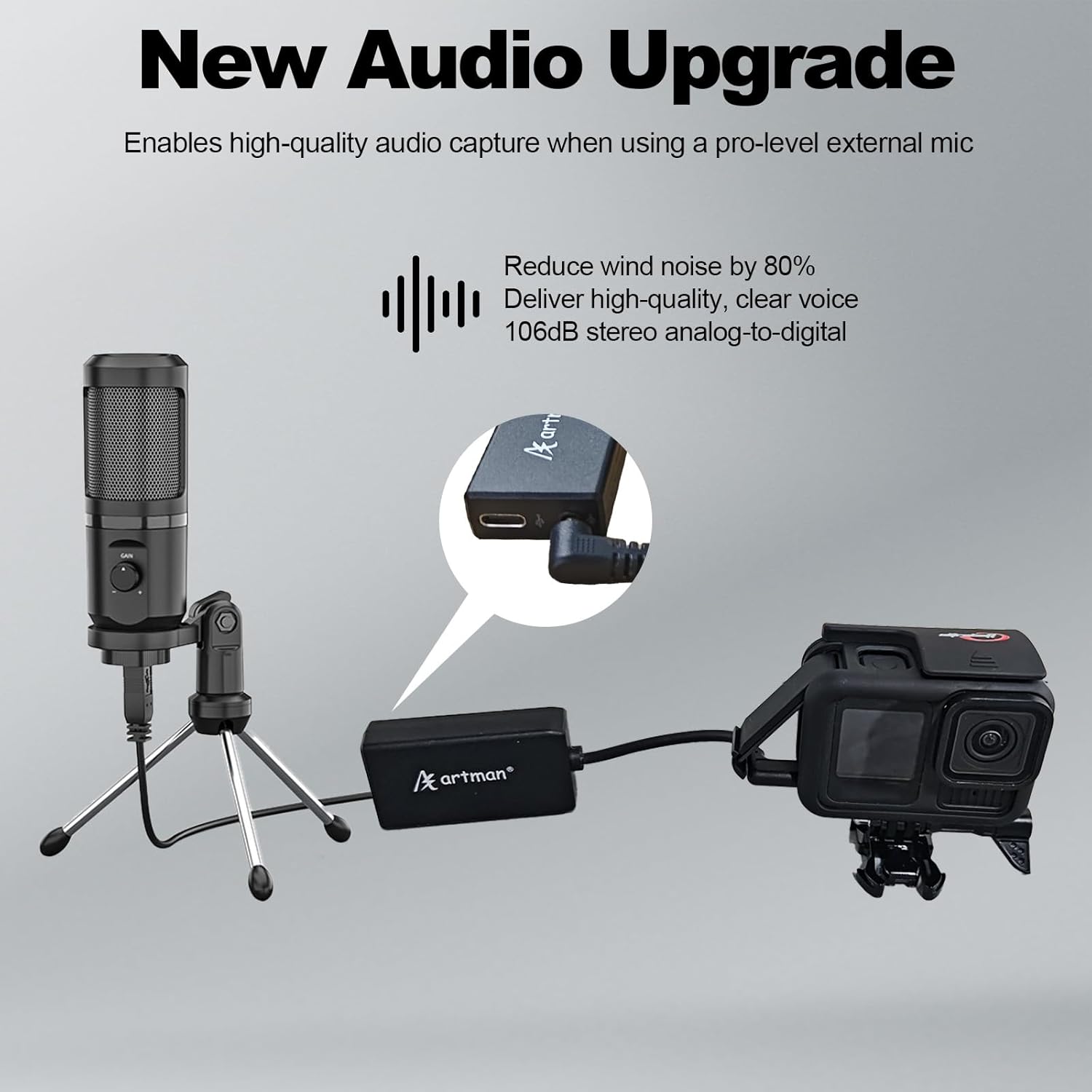 Artman Mic Adapter with Wind Noise Reduction, 3.5mm Microphone Adapter Compatible with GoPro Hero 13/12/11/10/9/8/7/6/5 Black, Clear Audio for Outdoor Vlog, Travel, Action Video