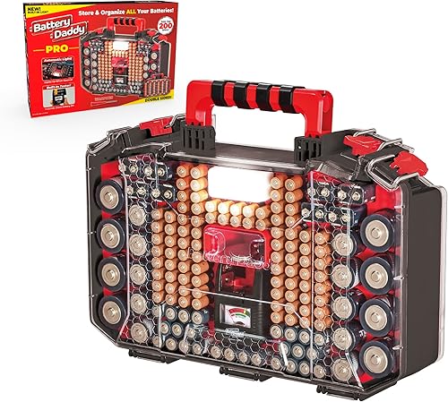 Battery Daddy Storage & Organizer Case with Light and Tester, Stores & Protects Over 200 Batteries, Double-Sided, Durable Design with Clear Locking Lid, Secure Latches & Portable Carrying Handle