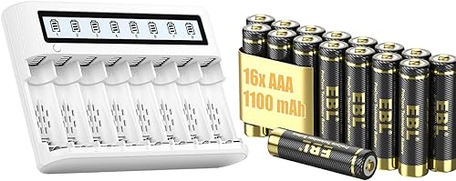 EBL Gold Pro Rechargeable AAA Batteries 1.2V 1100mAh NIMH Battery Upgraded High Performance AAA Batteries Precharged Triple A Battery - 16 Packs with 8 Bay AA AAA Battery Charger