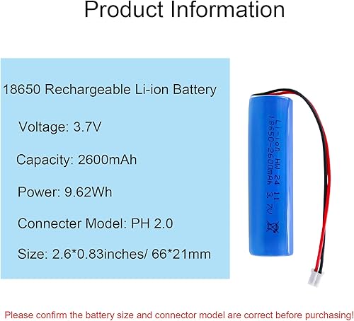 3.7V 2600mAh Li-ion Rechargeable Battery with PH 2.0 Connector for DIY Electronic Products, Lightings, Toys 3.7Volt 9.62Wh High Capacity Batteries