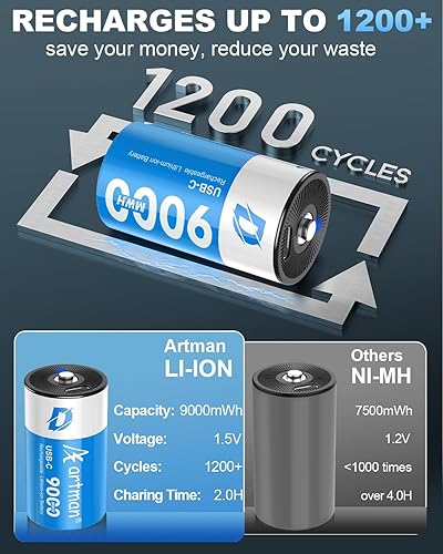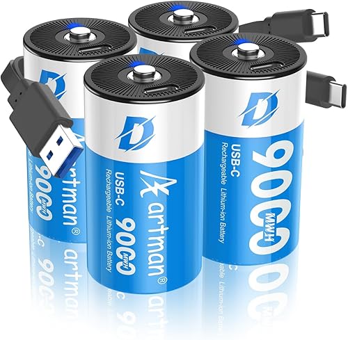Artman Rechargeable Lithium D Batteries 4 Pack, 9000mWh Rechargeable Lithium-ion D Cell Battery with 2 in 1 USB-C Charging Cable, 1.5V Batteries D Size for Floodlight Toys, Water Heater, Gas Stove