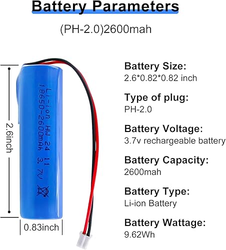 3.7V Battery 2600mAh High-Performance 3.7Volt Rechargeable Batteries with PH2.0/2P Connector for DIY Electronics Products, Flashlights, DIY Battery Pack, Electric Toys ect, 1Pack
