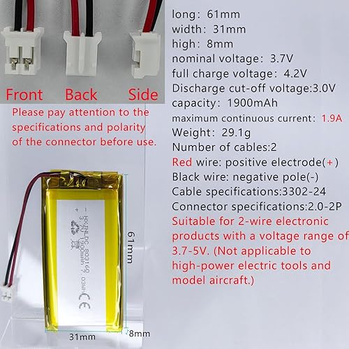 DC 3.7V1900mAh 803160 Rechargeable Lithium Polymer Battery, Suitable for DIY 3.7-5V Electronic Products with Built-in 2-Wire Battery Replacement and LED Lights