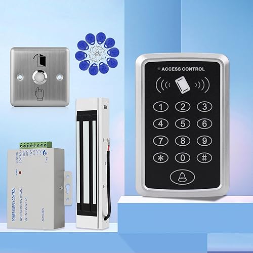 Standalone Access Control System Kit Keypad Controller Waterproof RFID Keypad Door Reader 180KG/350LBs Magnetic Lock + Stainless Steel Exit Button 10 ID Keychains