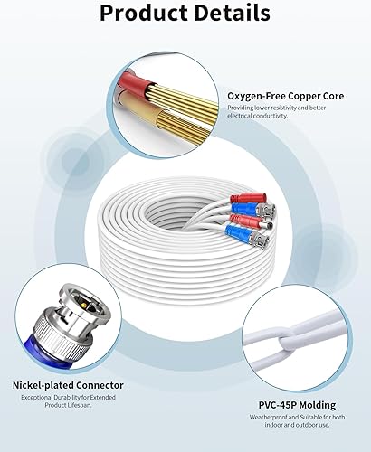 《TOUGH WEATHERPROOF DESIGN》OHWOAI’s white security camera cable features a UV-resistant PVC-45P jacket, which withstands extreme heat, rain, and snow. It can be buried underground, run through walls, or mounted on roofs—10 times more durable than cheap coaxial cables!