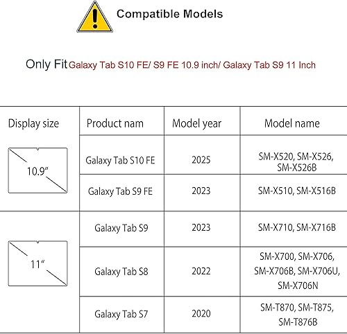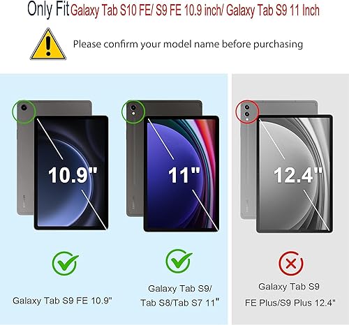 Universal Compatibility: Specially designed for Samsung Galaxy Tab S10 FE, S9 FE 5G 10.9"(SM-X510/X516B/X518U), Tab S9(SM-X716B), Tab S8(SM-X706C), and Tab S7 (10.9 inch)(SM-T870/T875/T878) ensuring perfect fit and full coverage.