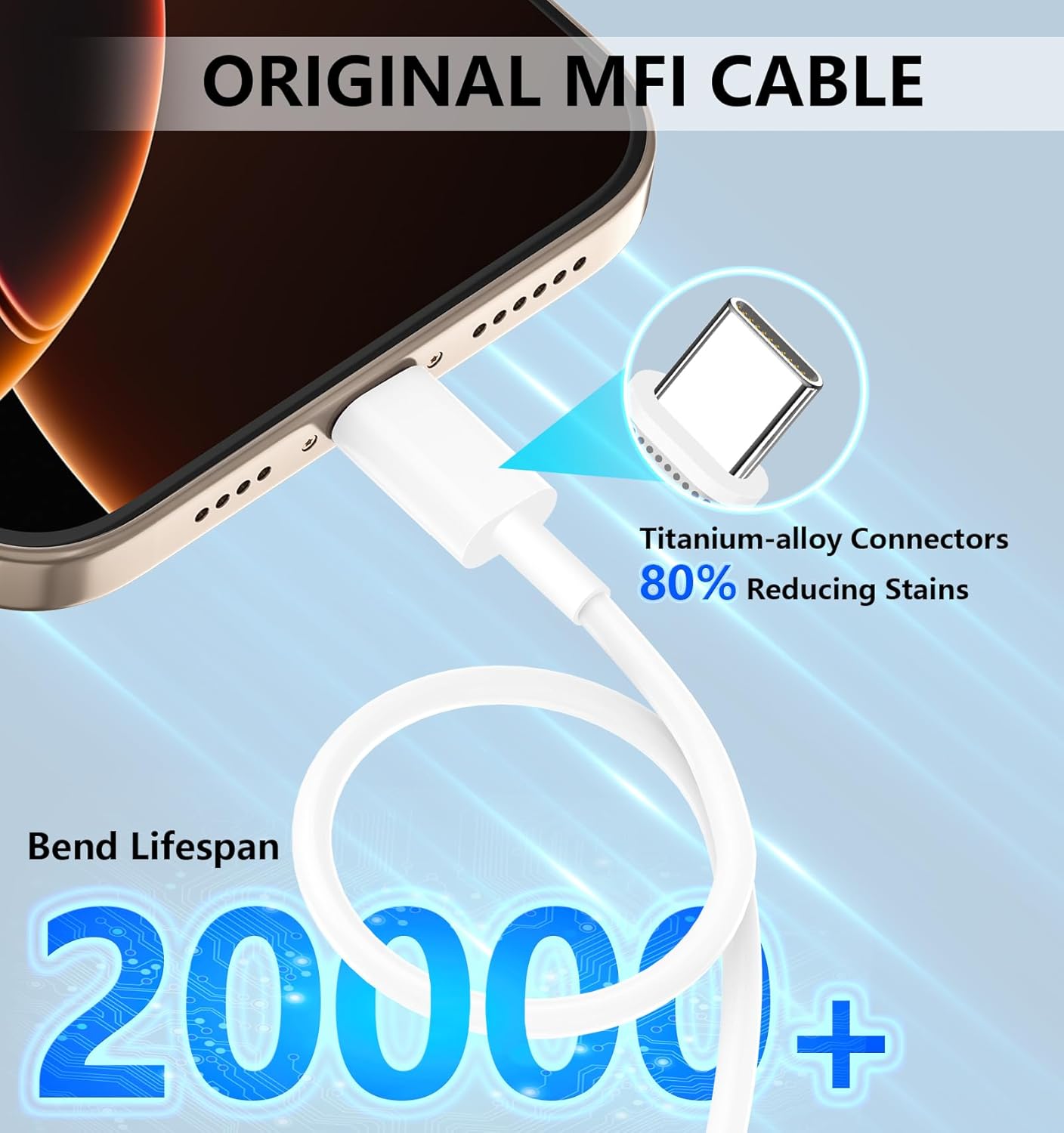 【ORIGINAL HIGH-SPEED CABLE】 10FT original cable supports 60W fast charging and 480M high-speed data synchronization, unlocking the full charging potential of your iPhone. Connectors are upgraded with titanium alloy coating, enhancing stability and durability while reducing false detection caused by stains by 80%. The 10FT length suits all scenarios: charging by the bedside or sofa, office desks, and hotel beds. The cord’s connector is upgraded to pass 20,000 bend tests, delivering a more stable current for an extended lifespan and safer charging.