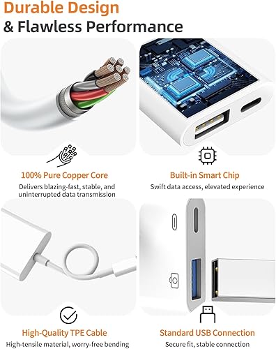 【Wide Compatibility】: The iPhone USB camera adapter supports standard photo formats (including JPER and RAW) and SD/HD video formats (including H.264 and MPEG-4). Compatible with iPhone 14/14 Plus/14 Pro/14 Pro Max/13/13 mini/13 Pro/13 Pro Max/12/12 mini/12 Pro/12 Pro Max/11/11 Pro/X/XS/XS Max/XR/8/8 Plus/7/7 Plus / 6s/6s Plus/6/6 Plus/SE and iPad Air / Mini / Pro