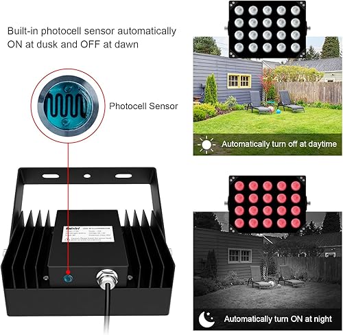 ▶️【AUTO ON and OFF】 - Ir floodlight for camera built-in with photocell sensor, the IR illuminators auto switch on at dusk and switch off at dawn, energy saving and secure long lifespan. Wave length 850nm infrared flood light, the beam light is INVISIBLE to naked eyes but give a red glow.