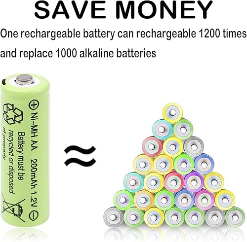 【Money-Saving】The rechargeable AA 200milliamps batteries can be constantly recharged 1200 times, saving you money on purchasing one-time use disposable alkaline batteries
