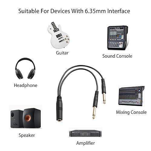 【Wide Compatibility】This 1/4" Stereo Y splitter cable is perfect for connecting instruments, microphones, and other to multiple mixers, consoles, and compatible with most professional and home audio devices, such as amplifiers, microphones, mixers, speakers, music keyboards, guitars, electric pianos, HiFi systems, home theater equipment, or AV receivers.