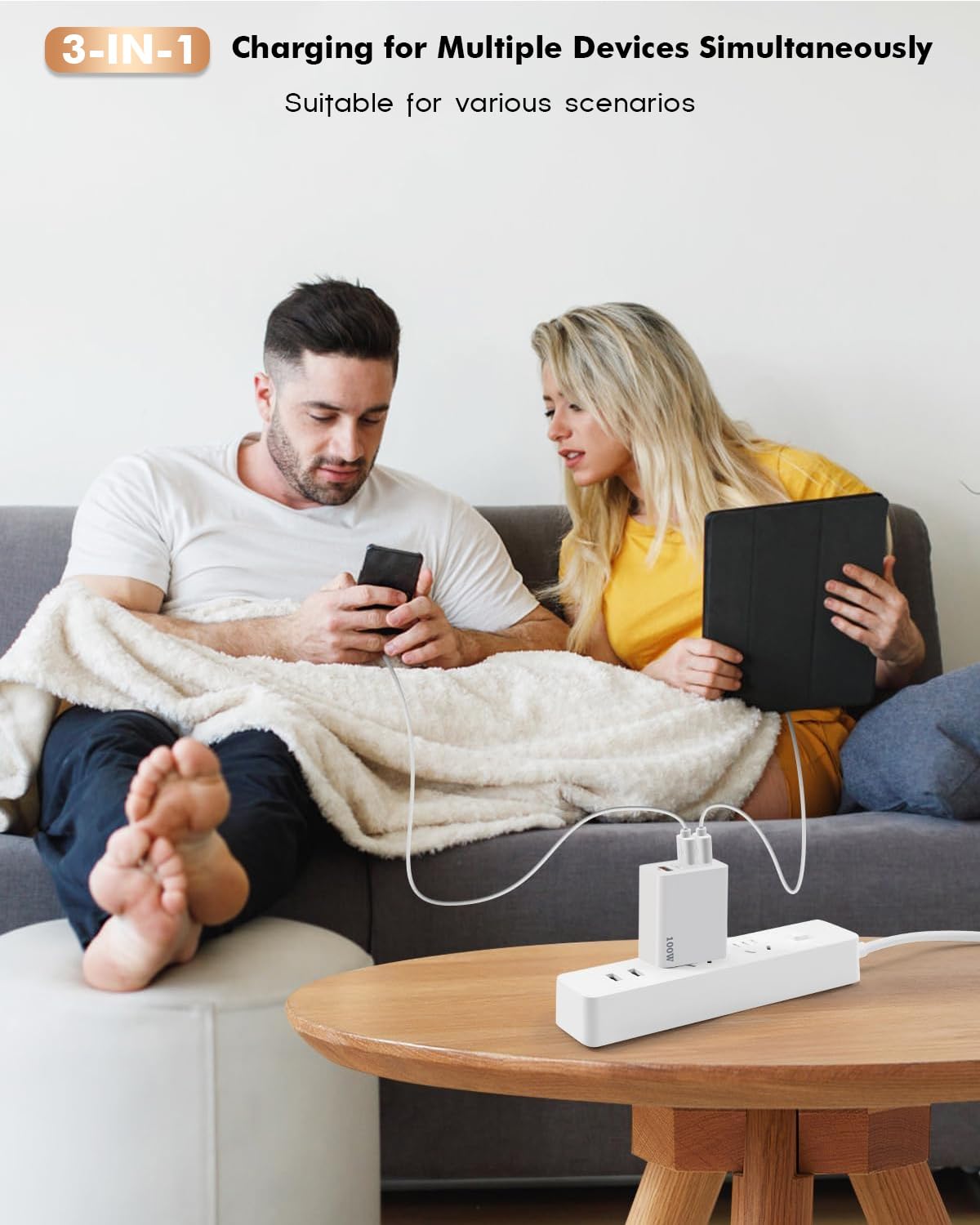 3 in-1 100W USB C Charger Block Fast Charging: The GaN 3-port 100w usb c charger block can be used as a laptop charger or iPhone 17 charger fast charging.The macbook charger has Dual USB C ports&one USB A port, which can quickly charge your macbook air,iphone 16e/15 and ipad pro at the same time to reduce your waiting time for charging.iphone 16 charger fast charging is suitable for various scenarios such as home,work,hotel(USB-C1 100W Max/USB-C2 100W Max/USB-A 60W Max)