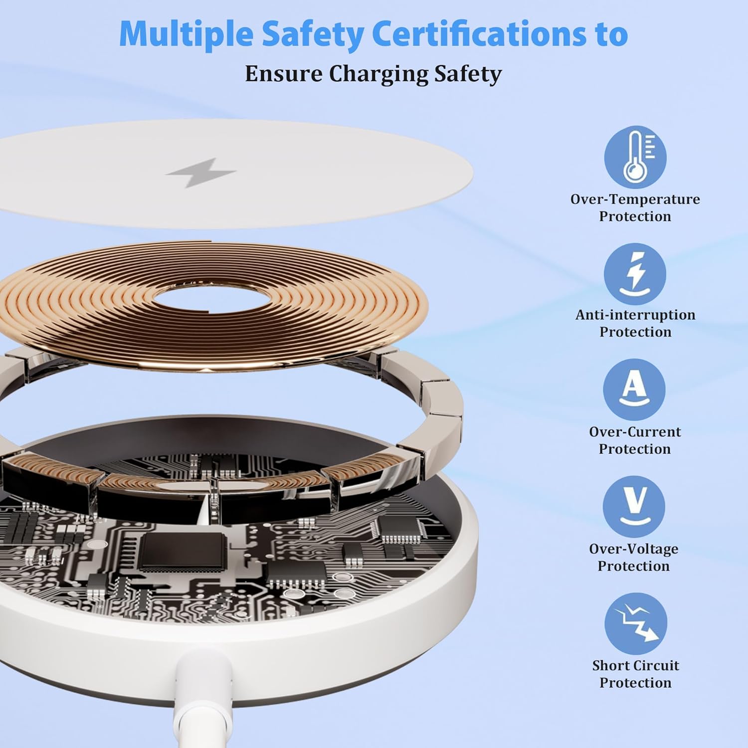 Magnetic,Stable 360° Adsorption Mag Safe Charger:Magnetic iPhone Charger firmly holds your iPhone while charging,no sliding or falling off, provides you a fast,safe and charging experience.The iPhone wireless charger fast charging pad features auto-alignment technology and a robust magnetic hold to ensure that your iPhone stays securely in place while charging