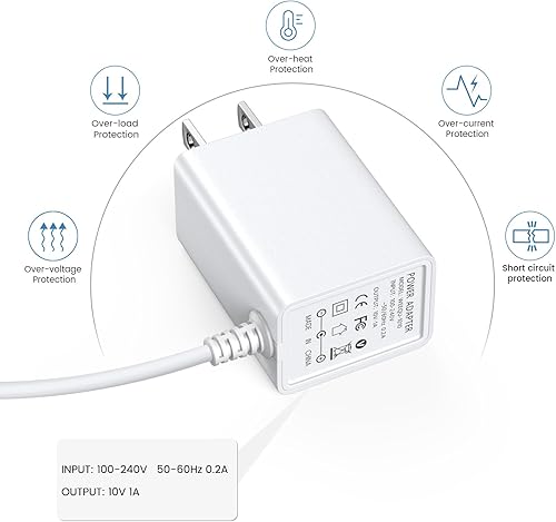 Input AC 100-240 volts, 0.2 amps, 50/60 hertz; Output DC 10 volts, 1 amps, 10 watts