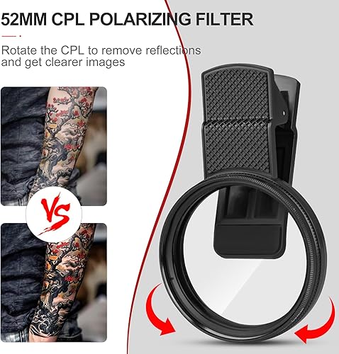 52mm Clip-on CPL Filter: The CPL Circular Polarizing Filter can effectively enhance the color,contrast and clarity, and remove unnecessary glares to show the real color and surface details.This filter lens could be rotated to adjust the polarization angle to take the best photo of your tattoo artwork.