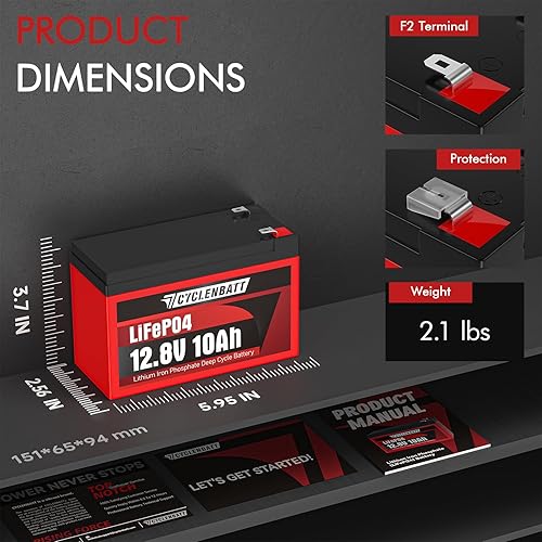 【The best alternative to lead-acid batteries】CYCLENBAT 12V 10Ah battery has the same size as the 12V 7Ah lead-acid battery, which can effectively save installation space. It's half the weight but has 3 times the energy available. 12V lithium battery are ideal as a replacement for lead-acid batteries.