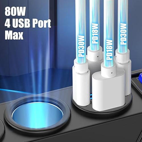 Super Quad-Port Fast Charging: Our 12V USB outlet now features a quad-port design—including 1 PD 30W port + 1 PD 36W port + 2 QC 18W ports—enabling simultaneous charging for four devices with a total output power of up to 80W. Compatible with PD 2.0, QC 2.0/1.0, and all other protocols for ultra-fast charging across devices.