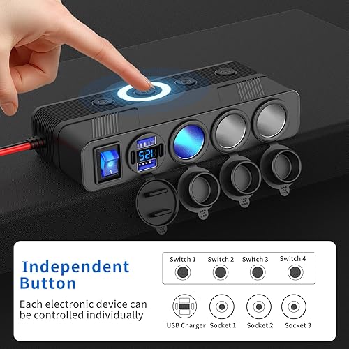 Independent Switch Control: This upgraded car charger splitter features four independent power switches, enabling separate control over three cigarette lighter sockets and four USB ports to accommodate diverse charging needs. Additionally, the 12V master power switch provides one-touch control over all devices, effectively protecting your vehicle's battery life.