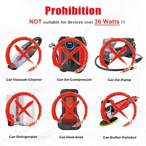 Warning: Not Suitable for High-Power Devices, such as air compressor, vacuum cleaner, air pump, car refrigerator, heated seat and other devices with power higher than 36W. Check your devices specifications before purchase, and choose suitable products from our shop