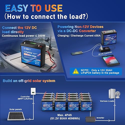【4P4S Expandable Power for Ultimate Versatility】 Unlock custom power with ERYY 12V kayak lithium battery! Carefully series/parallel connect up to 4P4S (48V/80Ah/4096Wh max) using identical 12V fish finder battery to boost voltage (24V/36V/48V) or extend capacity. These 12V boat batteries are ideal for scaling systems without replacing equipment. Perfect for router, security systems, water pumps, and car refrigerators. Pro Tip: For safe expansion: Use batteries with the same capacity (20Ah), voltage (12V), BMS (30A), and brand (ERYY). Additionally, before connecting in series or parallel, each individual battery must be fully charged (with a resting voltage ≈13.4V)
