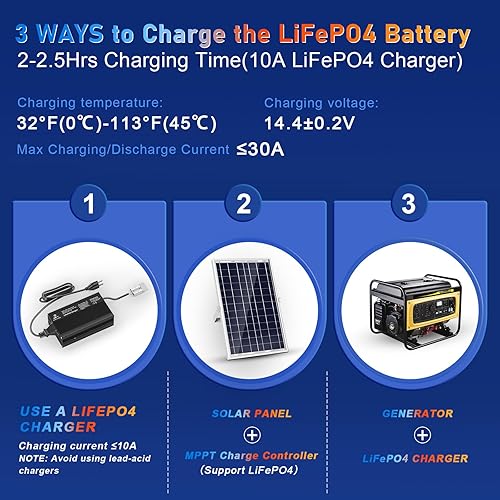 【12V Rechargeable LiFePO4 Battery - 3 Ways to Charge!】 Power your adventures with ERYY 12V 20Ah Rechargeable LiFePO4 Battery - the ultimate energy solution for off-grid living and mobile power needs. Engineered for versatility, it supports THREE smart charging methods: 1) Standard LiFePO4 charger (≤10A), 2) Solar panels with MPPT controller (LiFePO4 compatible), and 3) Generator pairing with LiFePO4 charger. Ideal for solar energy storage systems, emergency lighting, and kids' ride-on cars. Features safe operation within 32°F-113°F charging temperatures and 14.4V±0.2 voltage. Delivers stable power with ≤30A charge/discharge current. NOTE: NEVER use lead-acid battery chargers.