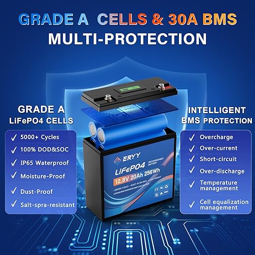 【Premium A-Grade cells. Robust 30A BMS. Ultimate outdoor energy.】Engineered for reliability, ERYY 12V lithium iron phosphate battery is built with top-tier A-Grade cells for 5000+ cycles (10+ years!) and stable performance from -20°C to 60°C. The advanced 30A BMS provides ultimate protection against overcharge, over-discharge, short circuits, and overheating, while balancing cells for maximum efficiency and lifespan. Ideal as a deep cycle marine battery 12V for fish finders, it also reliably powers portable outdoor speakers, car vacuum cleaners, and more. Trust the robust energy solution that won’t let you down