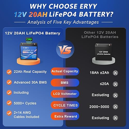 【Why Settle for Less? The Superior ERYY 12v LiFePO4 Battery Alternative】 Upgrade to ERYY 12V 20AH LiFePO4 lithium battery and experience true superiority! While competitors offer 18Ah±2Ah, we deliver a real 22Ah capacity - more power for your off-grid storage systems and marine trolling motors. Our Advanced 30A BMS outperforms others' ≤20A systems, ensuring safer operation. The built-in LCD voltage meter (missing in other brands) gives you real-time power monitoring. We(ERYY) include 2×14 AWG premium cables (others don't), plus 5000+ cycles lifespan dwarfs competitors' 2000-3000 cycles. The ultimate lightweight 12V trolling motor battery for serious boaters and off-grid living