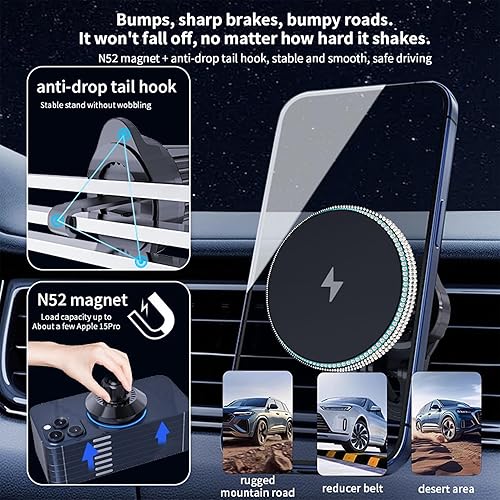 【Powerful Magnetic for Ultimate Stability】- The phone mount for car wireless charger is equipped with upgraded N52 magnets, this wireless car charger mount delivers a secure, snap-on magnetic hold that keeps your iPhone firmly in place—even on the roughest roads. Drive with confidence knowing your phone is safe, stable, and always within reach.