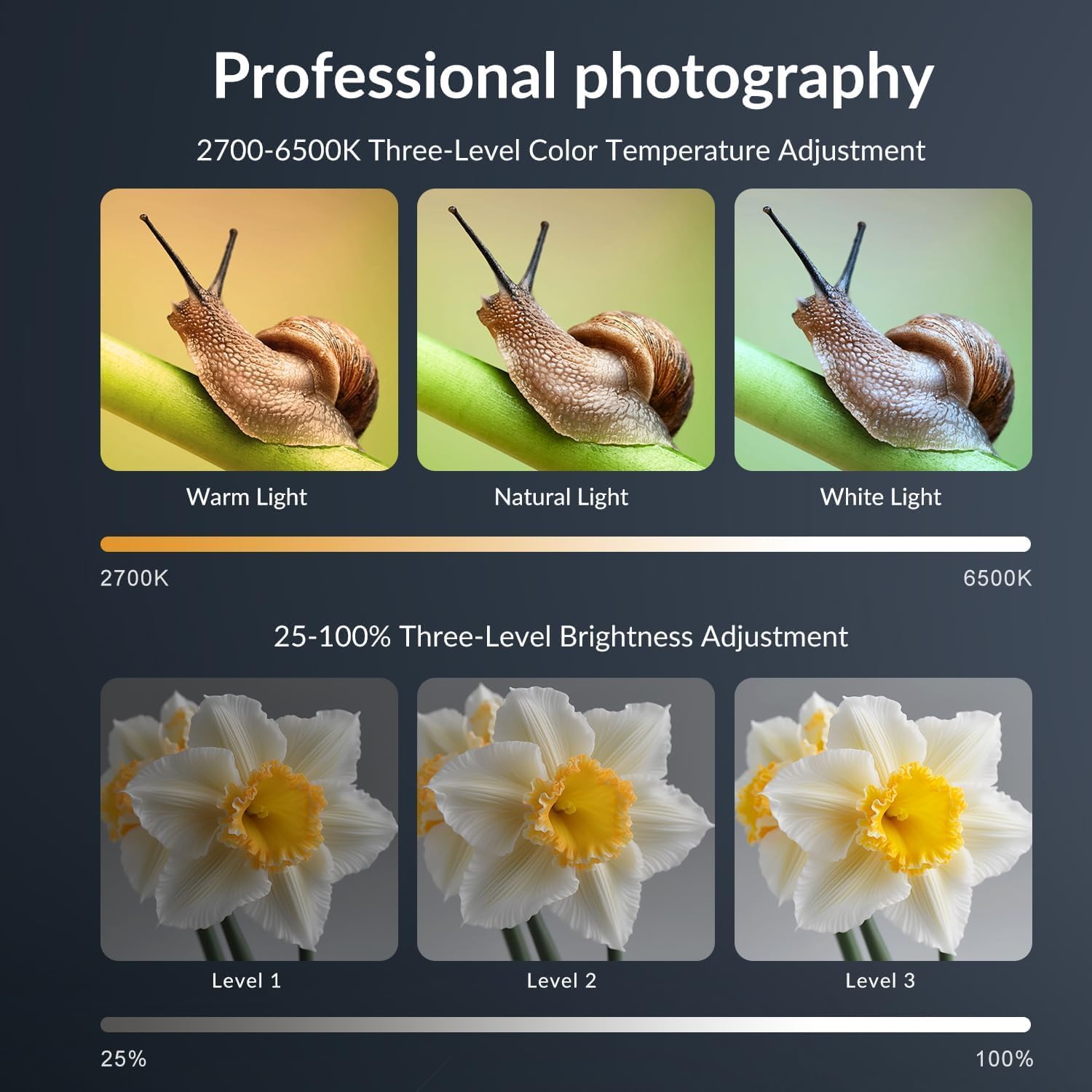 【Upgraded 2 in 1 Macro Lens】 Combining a 15x macro lens and fill light,equipped with 3 colour modes and 3 levels of brightness adjustment, 95+ CRI, allowing you to capture close-up shots at any time and provide suitable light supplement in any shooting environment.Perfect for shooting eyelashes, eyes,lips, nails, plants and animal details close-up.