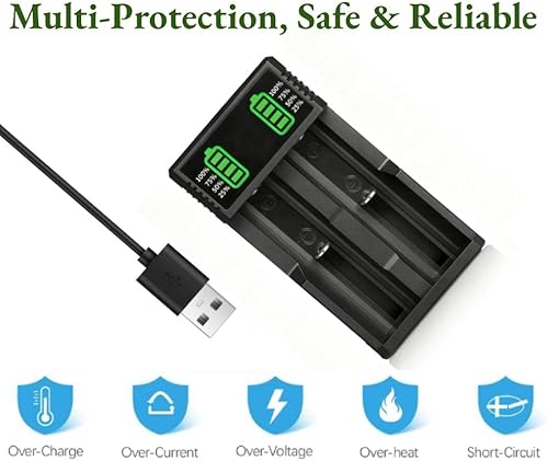 【Super Compatibility】- This universal battery charger applies to rechargeable battery as 32650, 26650, 26500, 25500, 22650, 22500, 21700, 20700, 18700, 18650, 18500, 18490, 18350, 17670, 17650, 17500, 17350, 16650, 16340(123A), 16500, 14500, , 10440, 10350, 10340, 3.6V/ 3.7V IMR/INR/ICR.