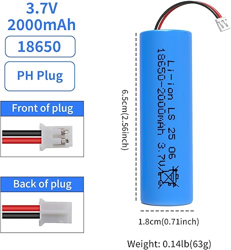 18650 Rechargeable Battery Pack with USB Charger Cable,3.7volt 2000mah Rechargeable Battery, PH 2pin Plug 18650 Batteries for Electric Toy Car& Small Fan&Electronic Devices Etc