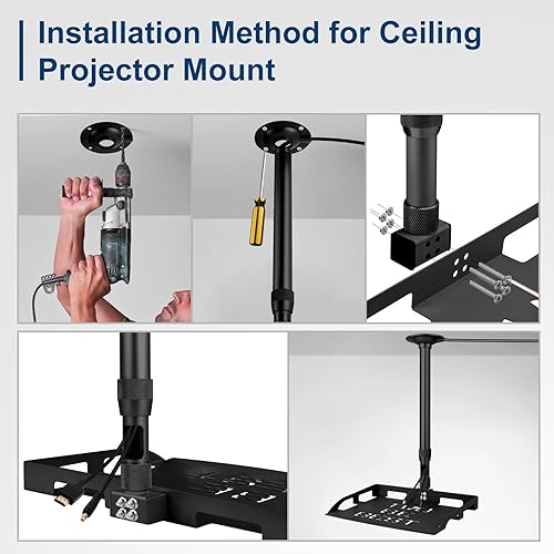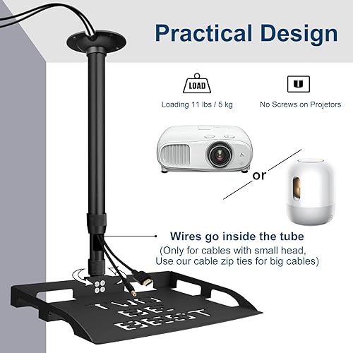 Practical Design: Projector ceiling mount has a upgraded hollowed tray bottom to ensure timely better heat dissipation. Don't worry about the projector overheating to stop using. Cables of projector can go inside the tube, securely housing power cords and cables. Note: cable zip ties included to manage big cables.