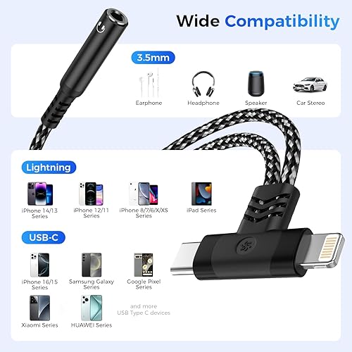 【Wide Compatibility of iPhone Splitter】This usbc and lightning headphone charger adapter is compatible with most type c and lightning devices.The iphone aux adapter is widely compatible with iPhone 14/14 Plus/14 Pro/14 Pro Max/13/13 Pro/13 Pro Max/12/12 Pro etc. USB C port is compatible with iPhone16/16 Plus/16 Pro/16 Pro Max/15/15 Plus/15 Pro/Samsung GalaxyS25/S24/S23/S22/S21/Ultra S22 series, etc. 3.5mm to usb c dongle works with almost all 3.5mm audio cables.