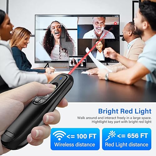 100FT Wireless Remote Control Distance & 656FT Light Display Range: Wireless presenter with light pointer for presentations control distance: 100FT, red light pointer range: 656FT. With this presentation clicker can allow you don't be tied to your computer. Feel free to roam around the office, classroom or auditorium while giving a presentation or lecture. This powerpoint clicker is suit for computer/laptop/mac,etc and it is a perfect toys for your pet(Not recommended for TV/LED/LCD screen)