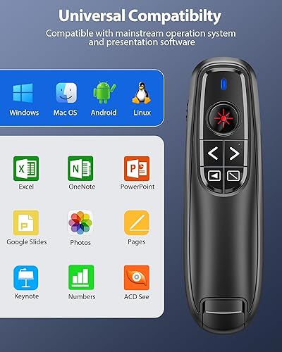 UNIVERSAL COMPATIBILITY LAPTOP CLICKER: This power point clicker wireless supports these operating system: Windows 2003/XP/Vista/7/8/10/11, Mac OS, Linux, Android. This presentation clicker for mac supports these office software: PowerPoint/Keynote/Prezi/Word/EXCEL/ACDSee/iWork/One-note/Google Slides,etc. With this pointer for presentations, you can interact with your audience and still maintain control of your laptop or pc. Product class: Class 3R. Max output power:<5mW