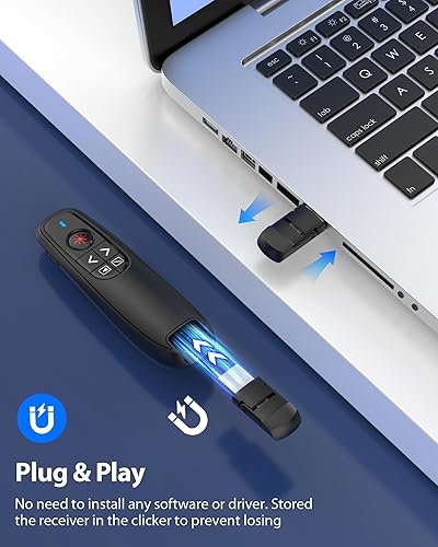 2-IN-1 USB TYPE C RECEIVER & PLUG AND PLAY: Designed with 2-in-1 USB and TYPE-C connector, the wireless computer clicker for presentations is plug-and-play. No software is required to install. You need 1 AAA battery installed into the wireless presenter remote to power it. The USB C receiver is stored in the remote clicker for presentations to prevent lossing. Adopted RF 2.4Ghz technology to maintain the steady signal reception.(NOTE: The AAA battery is not included in the package)